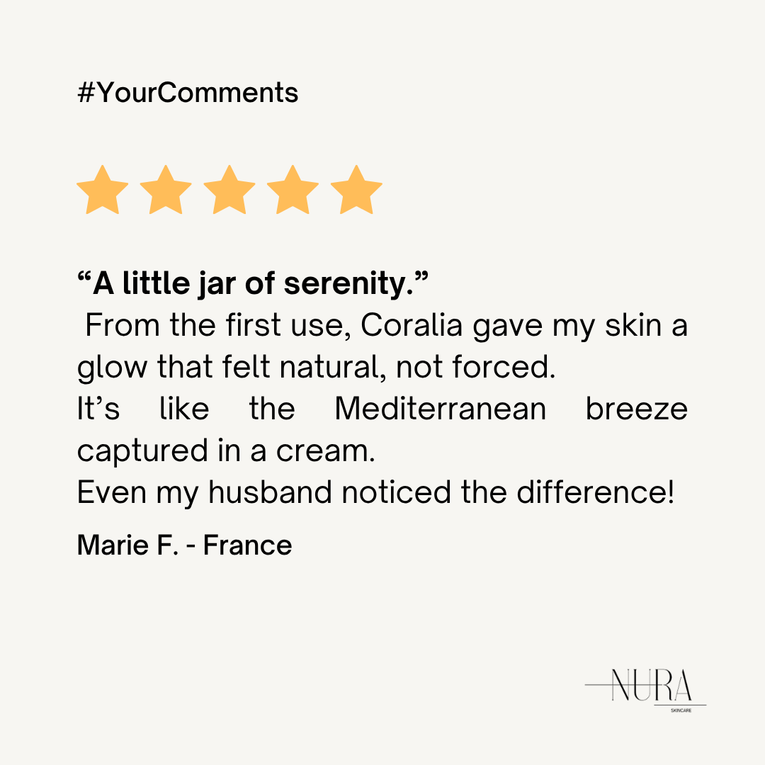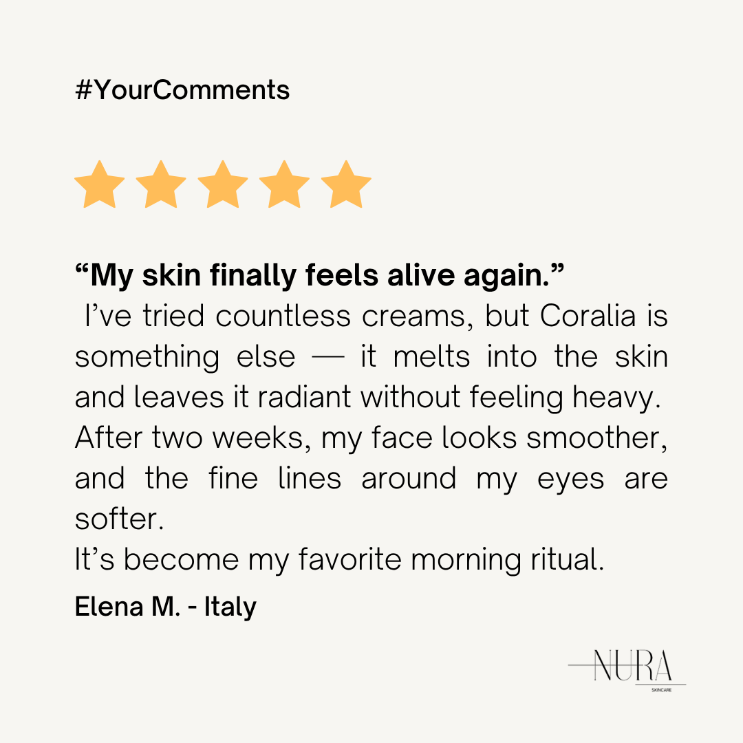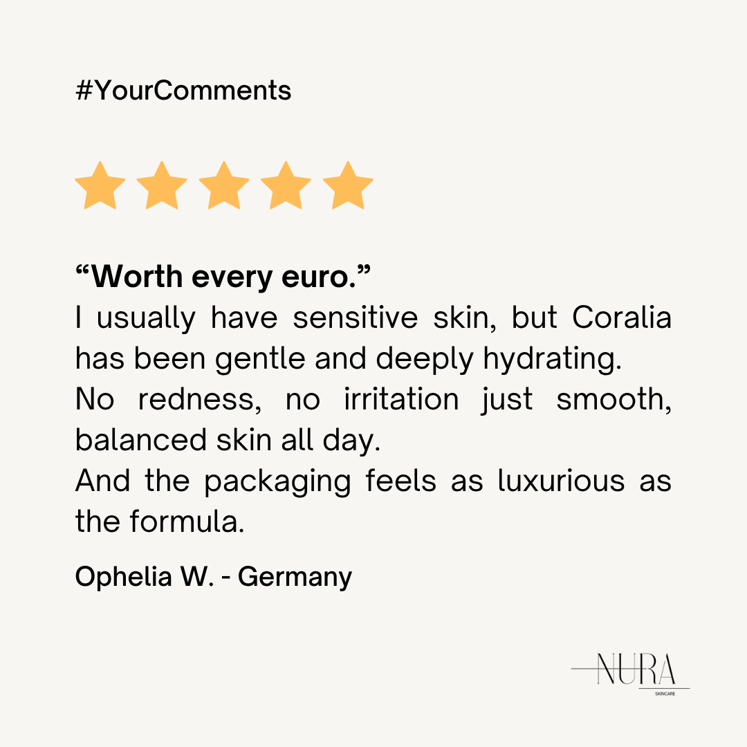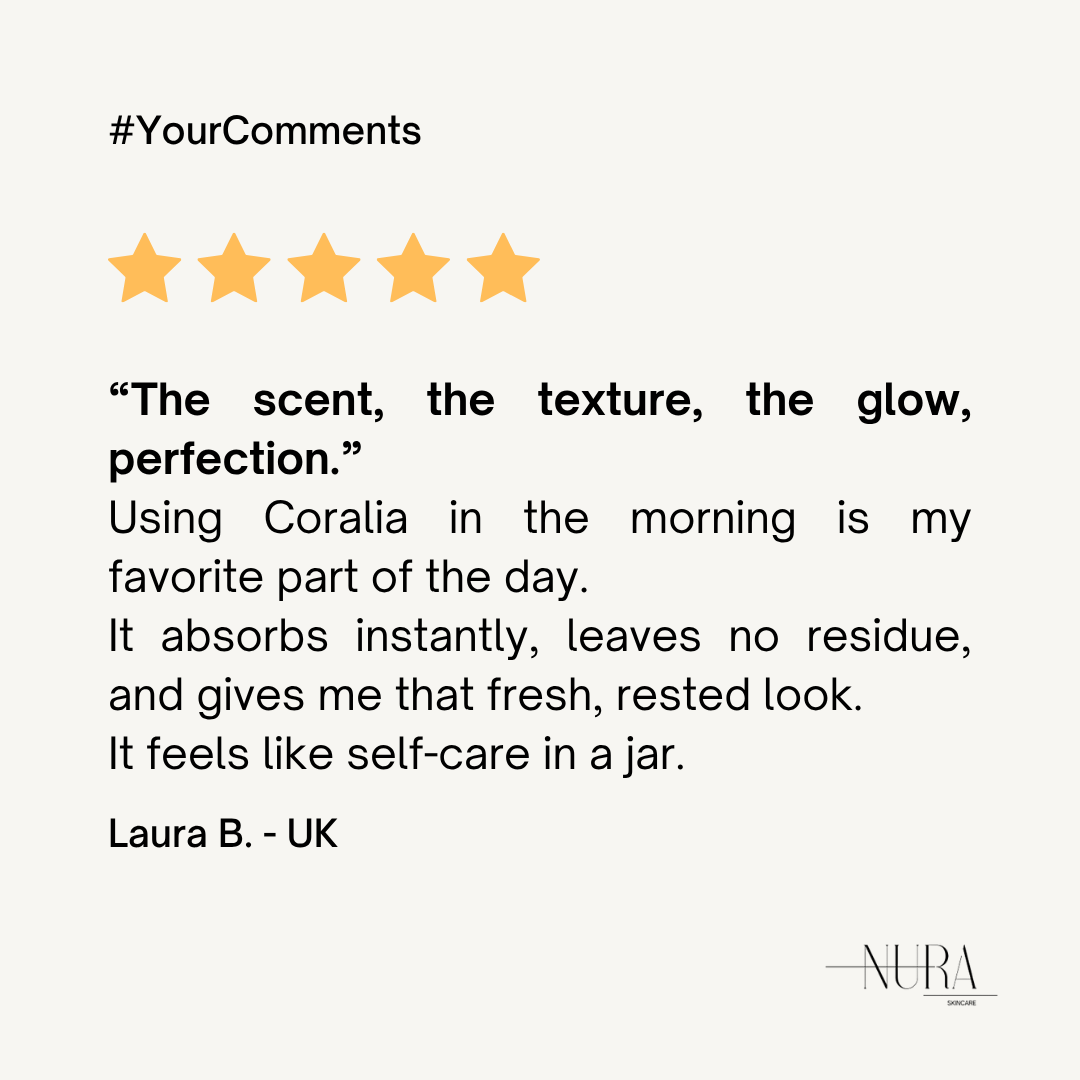 - Follow with your Luxia Serum and Coralia Cream to complete your Nura ritual.